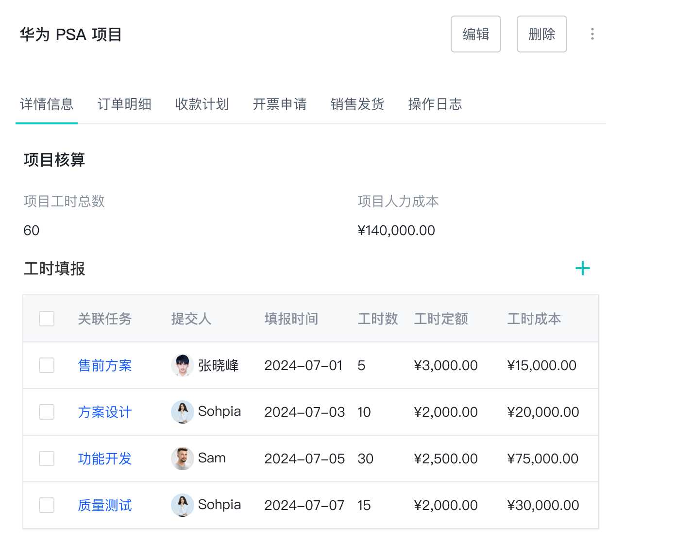 > 人事或财务为每个岗位或个人制定工时定额,系统会在工时填报后自动根据定额精确计算工时成本,并在项目中汇总并实时核算工时总数和人力成本